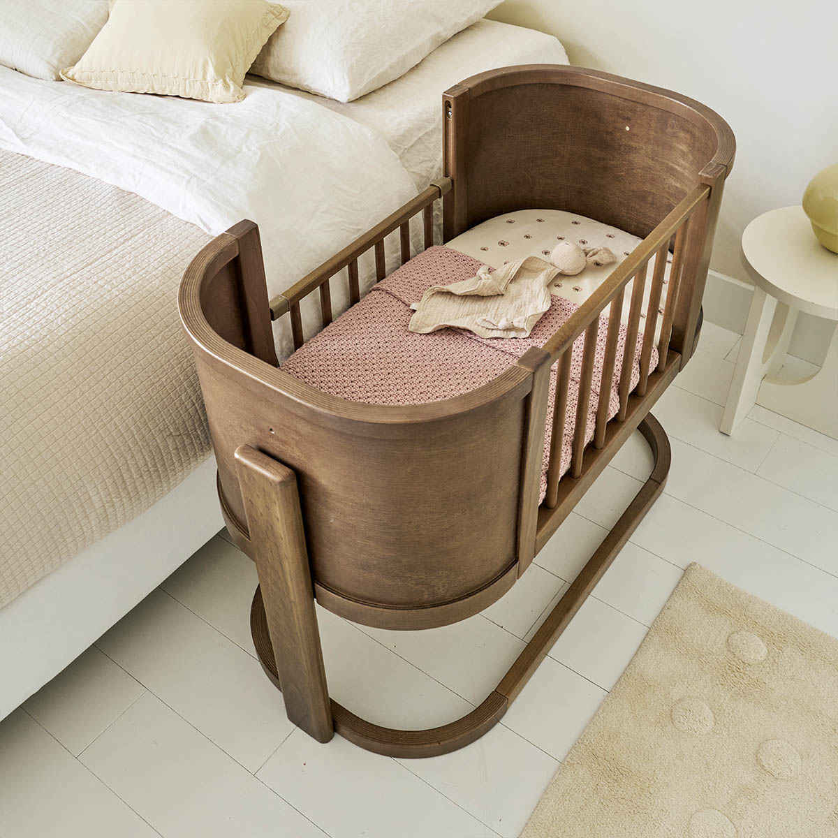 Beistellbetten wie die Modelle „Cocoon“ in Walnuss oder Cocoa und gemütliche Schaukelstühle wie das Modell Leandre in Sand schaffen die perfekten Kuschel-Inseln zum Vorlesen nach einem aufregenden Frühlingstag.